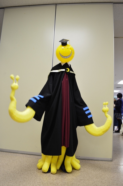 あけましてヌルフフフ ということで、今年も変な格好でスタートをしてまいりました。 私は素が地味なほうなので、人混みに紛れやすいのですが、 殺せんせー(2m)を着ていたおかげで友人にも無事発見していただけました。 「殺せんせーの全長なら見つけやすいはずなのに!やっと見つけた!」みたいな 事を言われましたが、すいません、寝坊しました 最近はアニメ効果とでもいいましょうか、普段とりたてて話題にのぼらないけれど面白い 漫画や小説でも、一旦アニメ化すると爆発的に広まるというルーチン的な流れが生まれて いるようなので、これで暗殺教室もワイワイ盛り上がっていただけると非常に嬉しいです。 ガタケ当日は、残念ながら暗殺教室のコスをされている方をお見かけする事はできませんでしたが、 3月あわせやります!という方がいらっしゃって大興奮でした。 収納の関係で、殺せんせーはすでに処分してしまいましたが、これからもコスされる方が 増える事を期待しています。撮るぜ撮るぜ!! この顔の角度がドSっぽいとライさんに大笑いされました ちがうの可愛いポーズなの!